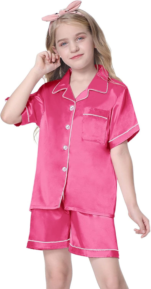 Girls Womens Pajamas, Satin Silky Pjs Set Kids 2Pcs Button-Down Nightwear Sleepwear Gift for Mommy and Me